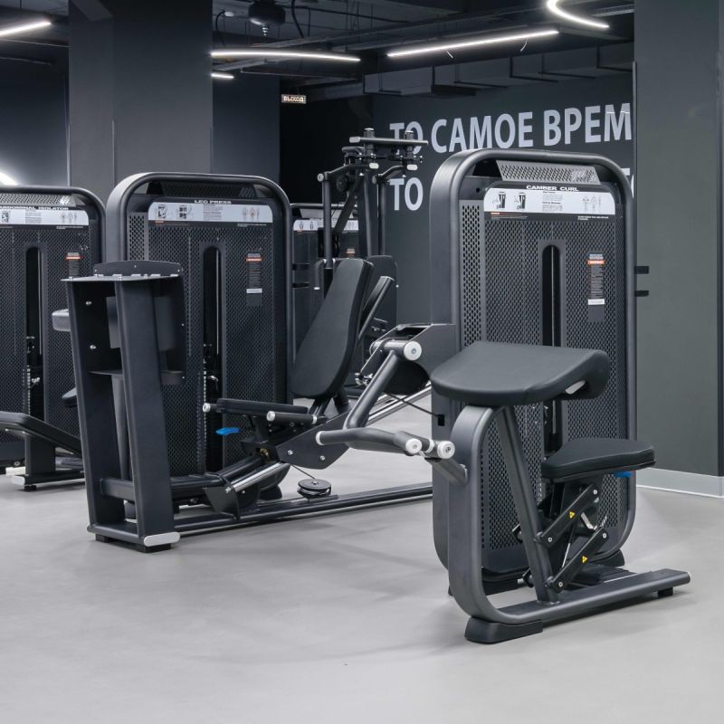 Профессиональный тренажер для коммерческого использования E7003 Жим ногами предназначен для тренировки передней и задней поверхности бедра, больших ягодичных мышц. Принцип работы заключается в сгибании и разгибании коленного сустава в положении сидя.