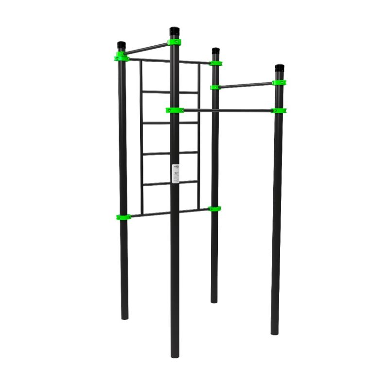 Компактный, но функциональный комплекс включает шведскую стенку и три турника, расположенных на разной высоте. Позволяет выполнять базовые упражнения на силу, координацию, гибкость и выносливость. Отлично подходит для установки в ограниченном пространстве – на дворовых площадках, у школ, спортивных клубов.