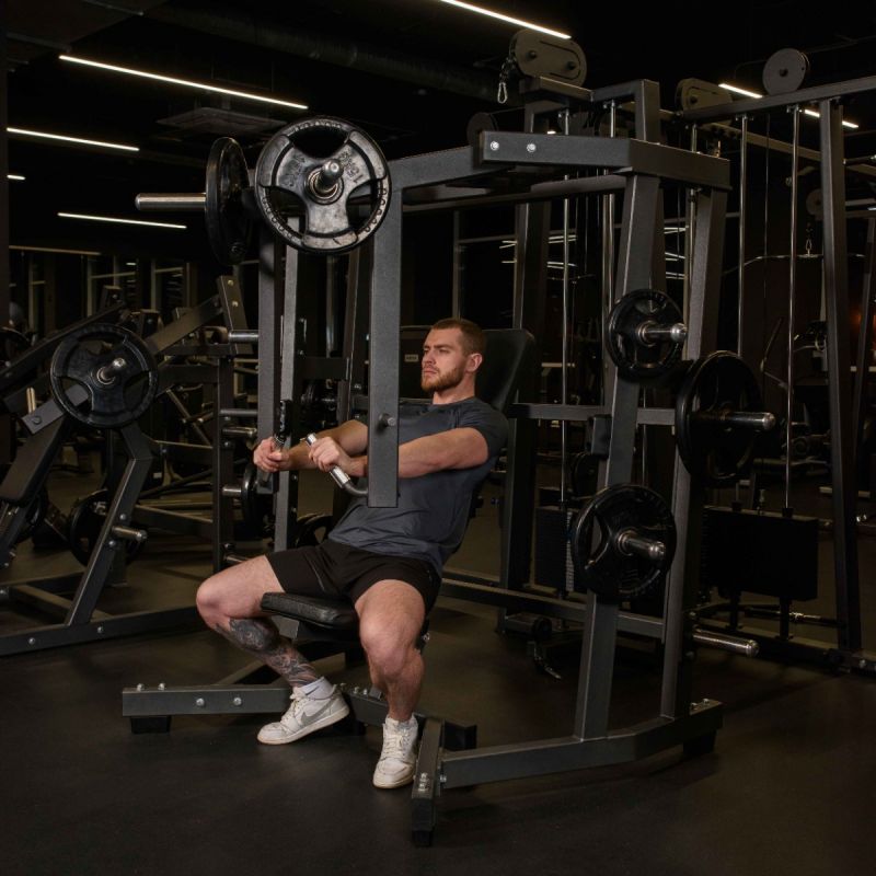 Жим от груди широким хватом максимально нагружает большие грудные мышцы и практически исключает из работы трицепсы. Рукоятки расположены шире, а траектория движения рукояток более сходящаяся, в сравнении с тренажером Независимый жим на низ груди, поэтому занятия на тренажере подойдут опытным спортсменам с широкой грудью.