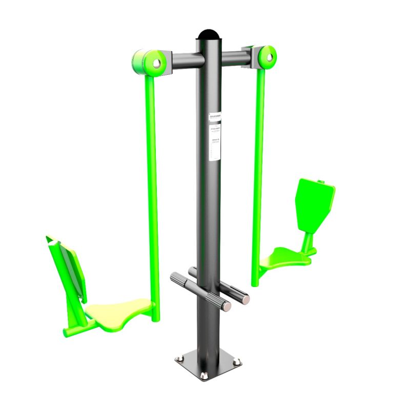 Оборудование состоит из опорного столба, рычагов со спинками и сиденьями, упоров для ног и закладной. Закладная монтируется в грунт и заливается бетоном. Опорный столб крепится к закладной за счет фланцевого соединения и отсыпается песчано-гравийной смесью до уровня площадки. Фланцевое крепление позволяет надёжно смонтировать оборудование и беспрепятственно демонтировать при необходимости обслуживания. Монтажные схемы прилагаются к комплекту поставки.